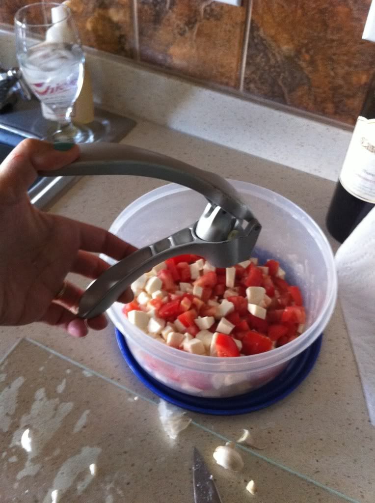 Dice up the tomatos and cheese and toss into a bowl